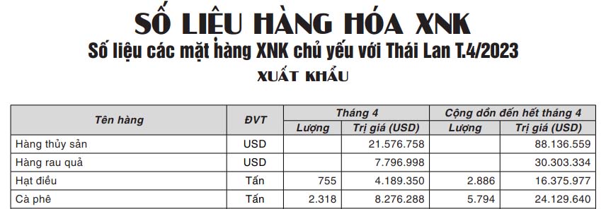 Số liệu các mặt hàng XNK chủ yếu với Thái Lan T.4/2023