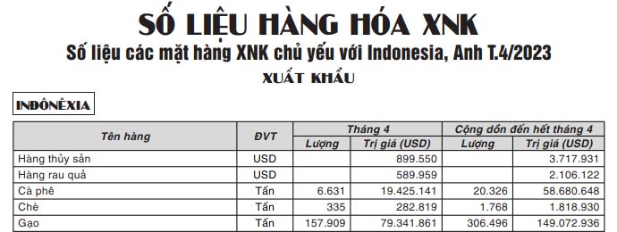 Số liệu các mặt hàng XNK chủ yếu với Indonesia, Anh T.4/2023